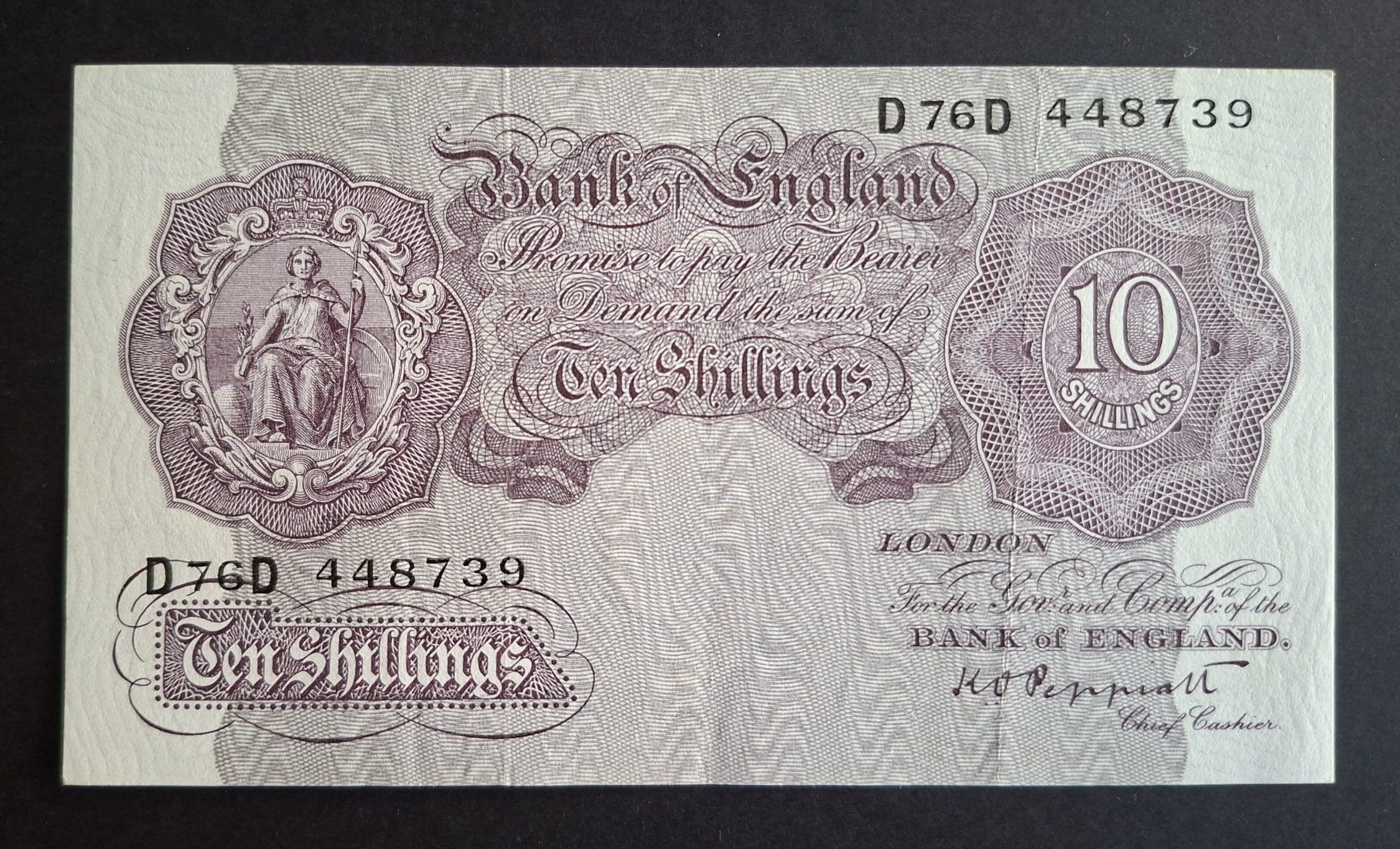 Sold £32.00 Sold SKU: G250212 Categories: All Banknotes, English Notes Description Description A great value B251 note. Ten Shillings. Emergency War Issue. Priced significantly below EPM. Free UK postage. International postage Flat Rate of £10. Related products £5 Fforde B312 (EF) U04 626664 £29.00 Add to cart £10 Gill B354 Last Series (AUNC) JR21 587327 £39.00 Add to cart £5 Kentfield B364 (AUNC) – BH20 698725 £19.00 Add to cart £1 Page B340 (AUNC) E21N 685859. Last Series Page Prefix £19.00 Add to cart