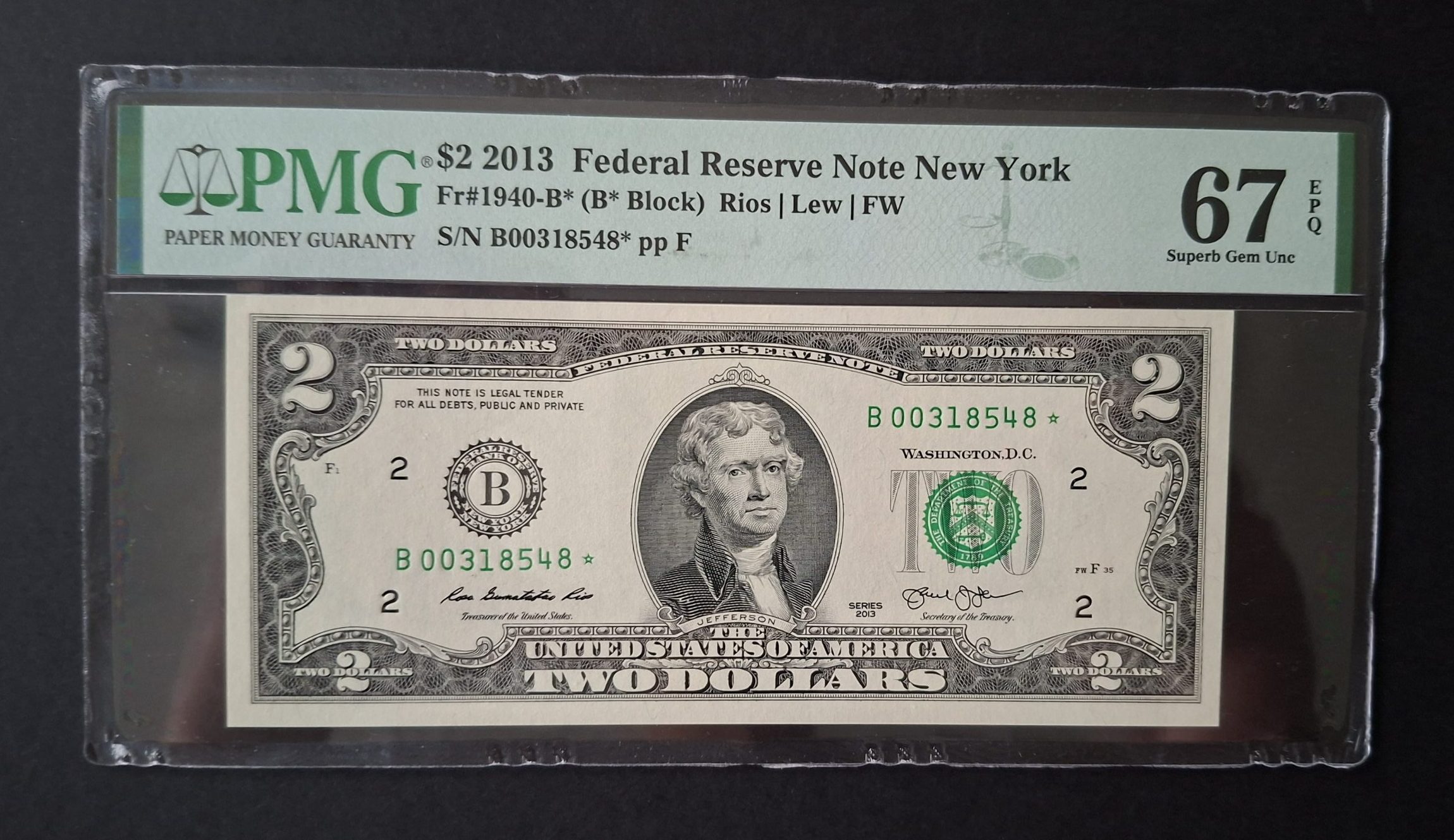 £49.00 1 in stock 2013 $2 Federal Reserve New York Star Note. PMG 67 EPQ (UNC) B00318548* quantity Add to cart SKU: G250194 Categories: All Banknotes, First & Last Banknotes, USA Coins & Banknotes Description Description 2013 $2 Federal Reserve New York Star Note. PMG 67 EPQ (UNC) B00318548* Free UK postage. International postage Flat Rate of £10. Related products £5 Kentfield B364 (AUNC) – BH20 698725 £19.00 Add to cart Sold £5 Northern Bank Y2K Prefix P.203b (UNC) Y2K02824 – Low Serial Number £45.00 Read more £1 Fisher Treasury Note T34 Last Series (VF+) X1/20 264265 £225.00 Add to cart £5 Royal Bank of Scotland P362 QEII Golden Jubilee (UNC) TQGJ 0001103 – Low Serial Number £49.00 Add to cart
